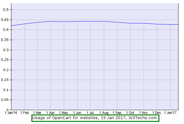 OpenCart is an online store management system. It is PHP-based, using a MySQL database and HTML components. Support is provided for numerous languages and currencies, and it is freely available under the GNU General Public License ( Wikipedia). 632,421 sites use OpenCart for their websites ( source ). You can also check the below image for the historical trend in the percentage of websites using OpenCart ( Source ).